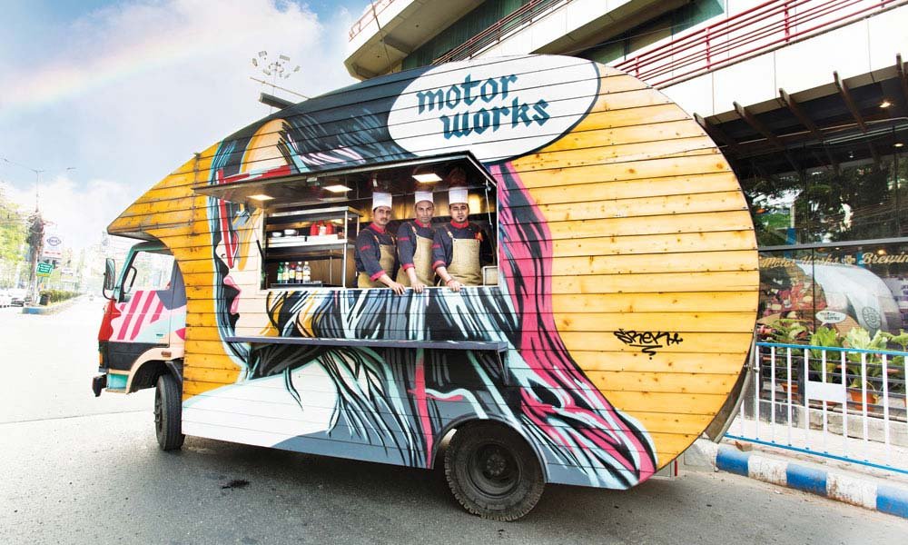 Motor Works = The enormous food truck which forms the live kitchen for the brewery and this exotic outlet is always ready to move, is always on the go! Brewing Company = The Open Brewery which is a part of the bar and customers can see the brewing action live.