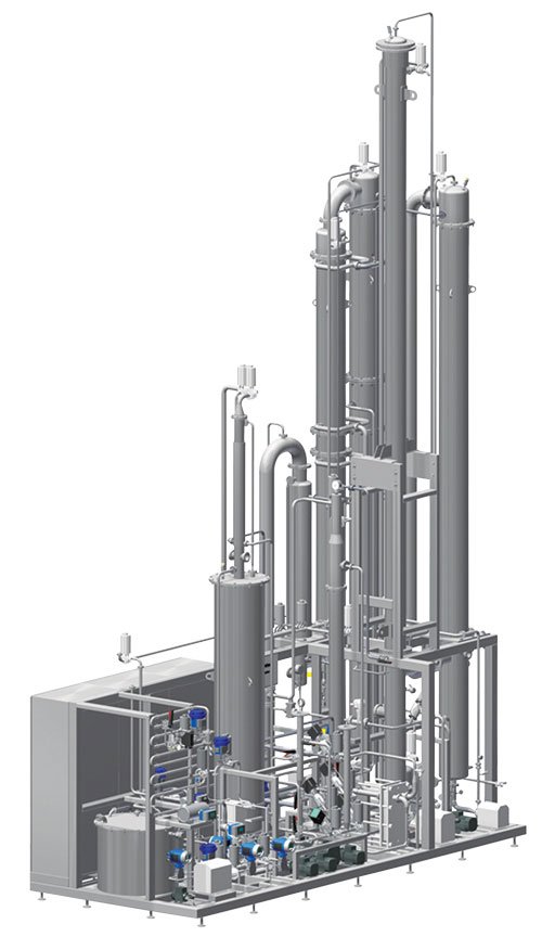 The DeAlcoTec technology is based on the principle of vacuum evaporation and is applicable for beer, wine, cider and other alcoholic beverages and products. It is a fully-automated, gentle process with selective alcohol removal and very little loss of aroma. In the case of beer, after gentle pre-heating at a low temperature, CO2 is removed by degassing and the product is sent to the specially-designed evaporation column, where the beer vapour flowing in the counter-current direction to the product removes the alcohol. On top of the column, the first stage of aroma recovery is included. The resulting alcohol-free product is chilled and blended to the required gravity and subsequently carbonated. The alcohol-rich exhaust vapour is condensed and gives saleable alcohol of up to 90 vol% using an additional rectification column. The aroma obtained from the vapour and CO2 is recycled to the product by a recovery system. Each heating/cooling circuit has an individual conditioning loop for better temperature control during distillation, without loss of aroma.